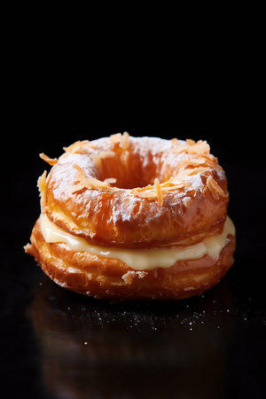 A detailed close-up photograph of a cronut resting on a smooth black surface. Freshly baked cronut - flaky croissant-doughnut hybrid