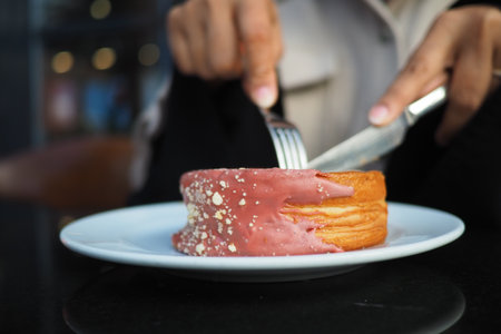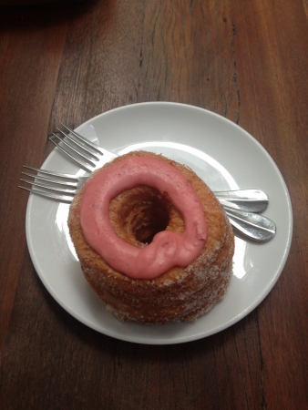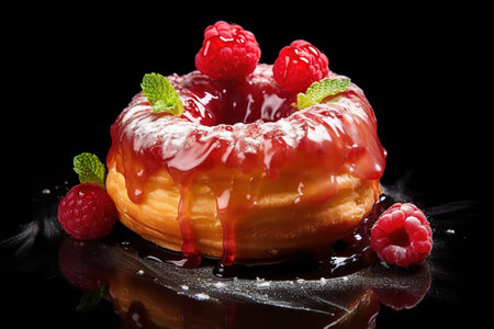 A mouthwatering cake covered in icing and adorned with fresh raspberries on top. Freshly baked cronut - flaky croissant-doughnut hybrid