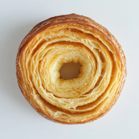 This image showcases a beautifully crafted croissant pastry with intricate spiraled layers and a golden-brown crust, ideal for food lovers and culinary art.