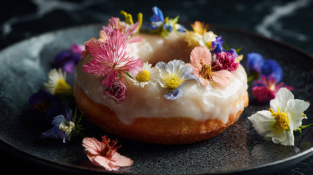 This stunning image features a donut topped with a creamy glaze and adorned with a variety of colorful edible flowers, set against a dark marble background, emphasizing its artistic presentation.