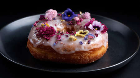 A beautifully crafted gourmet doughnut adorned with vibrant edible flowers and styled with a glossy floral icing on a black plate.