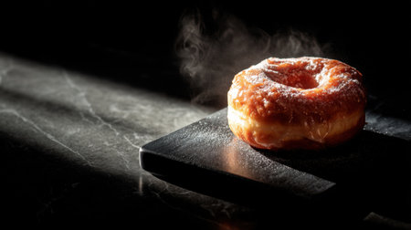 A freshly baked donut sits on a dark surface with steam rising, capturing the essence of warmth and delicious flavor under natural light.