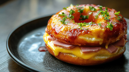 A delectable glazed doughnut filled with cheese and ham, garnished with fresh herbs. Perfect for a breakfast treat or a savory snack option. Enjoy the rich flavors!