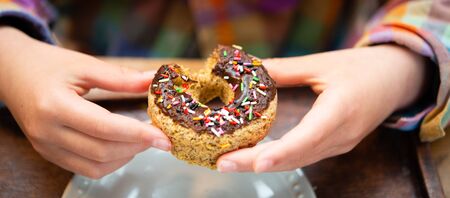 Handmade sweet donut with colorful sprinkles on top. Banner composition