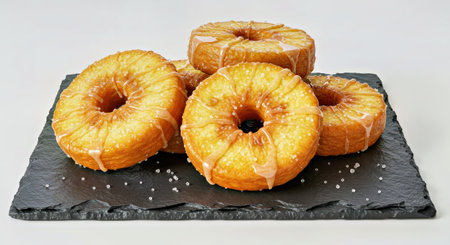 Homemade Apple Fritters Drizzled with Sweet Glaze on Elegant Slate Tray Studio Lighting