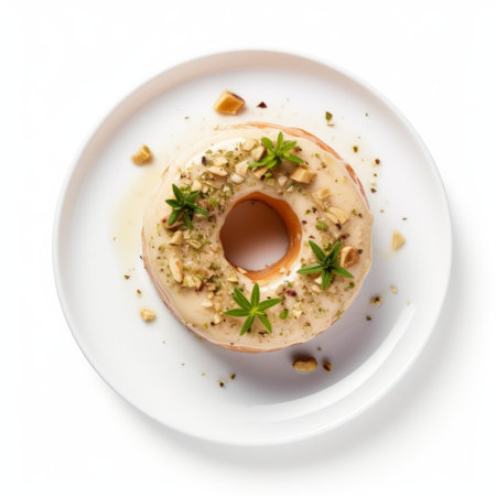 donut dish with roasted swordfish steak and garlic arranged in a top view on a white background. ai generated