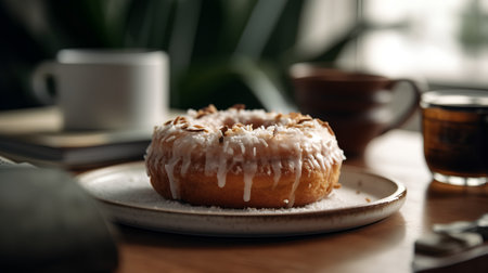 baked vegan doughnuts with sugar glaze on a plate, created with generative ai