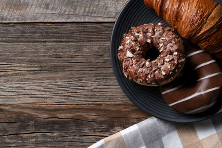 Freshly baked french croissant and colorful glazed donuts exposed on the decorative platter with juicy cherries scattered on the side. Everything placed on vintage wooden table.