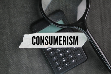 A calculator a magnifying glass and a white sticker with the word consumerism the protection or promotion of the interests of consumers