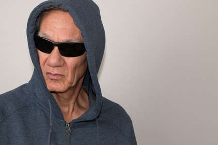 Man with a serious face in profile dressed in a hoodie on a blue background.