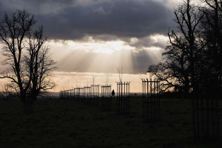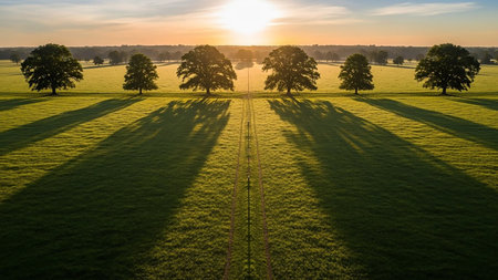 Casting showing symmetrical row of large oak trees casting long shadows across a lush green field at sunrise with a clear blue sky and bright sun. resolution...