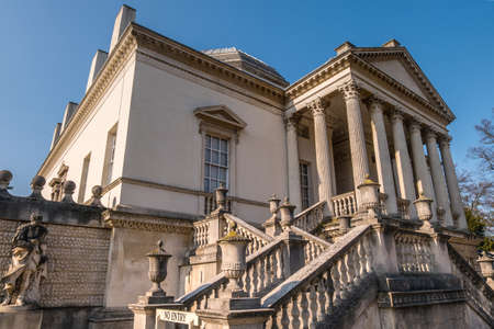 LONDON, UK - MAR 31, 2019 : By the side of Chiswick House on West London, Uk. Chiswick House is a magnificent neo Palladian villa set in beautiful historic gardens.