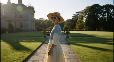 Beautiful young woman in elegant dress and straw hat walking in the park