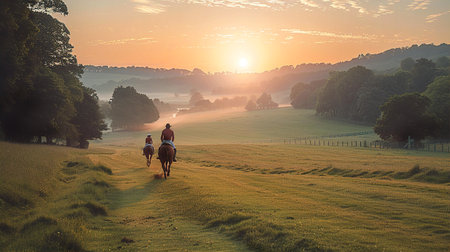 English Polo players are riding horses back to stables after a game at sunset. Beautiful English countryside landscape