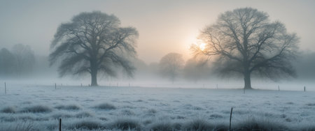 AI Generated. Misty rural landscape with frosty fields and bare trees on a foggy morning