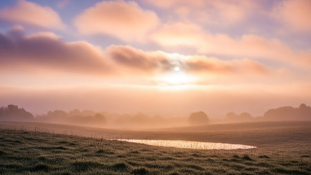 Sunrise showing misty sunrise over a dew-covered grassy field with a small pond and soft pink clouds. resolution use.