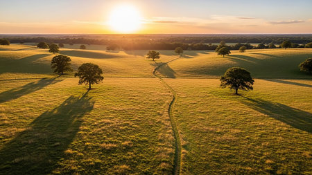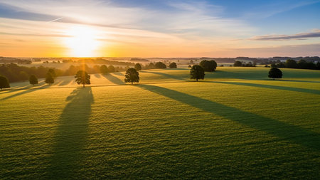 Landscape showing rolling green hills bathed in the warm glow of sunrise with long shadows cast by scattered trees across the dew-covered grass keywords: sunrise,...
