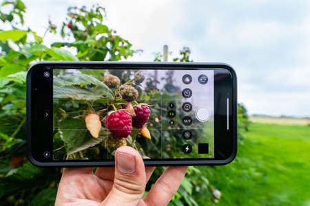 Close-up of hands holding a smartphone and taking a horizontal photography of cherry harvest in blue metal bucket