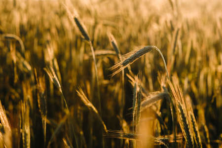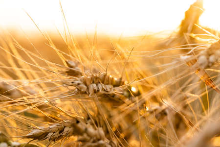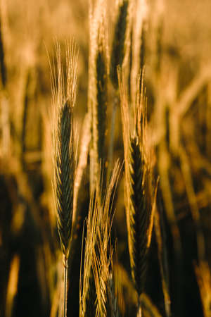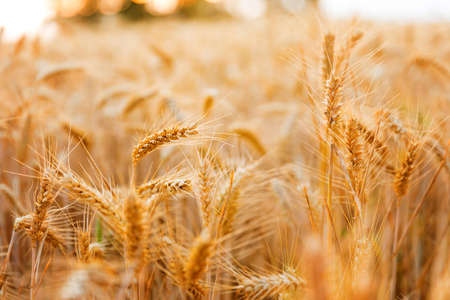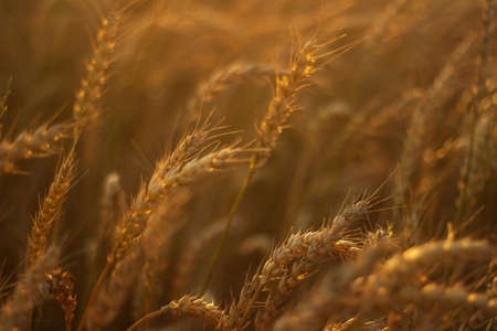Wheat field. Ears of golden wheat close up. Rural Scenery under Shining sunset. close-up selective focus