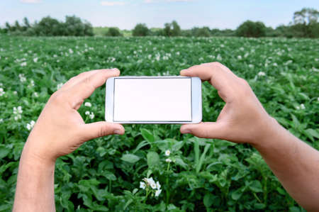 Hands of young man holding mobile phone and taking photo of cereal plant field in golden sunset. Modern technology using for social media content making