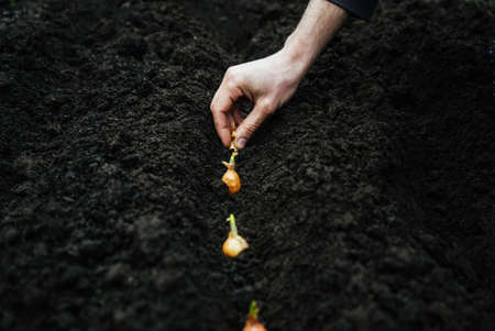 man digs a garden shovel hole in the ground to plant a flower, planting the seedling with the gardening tool