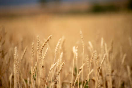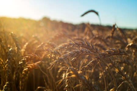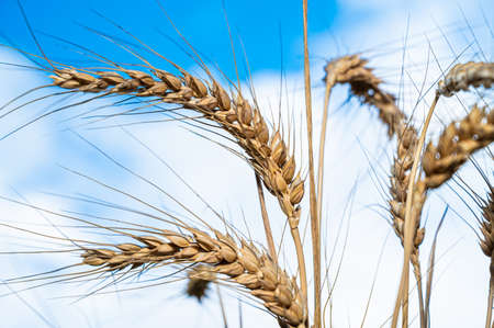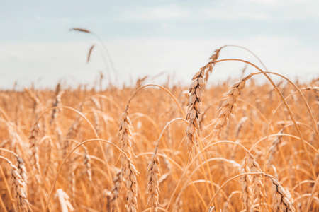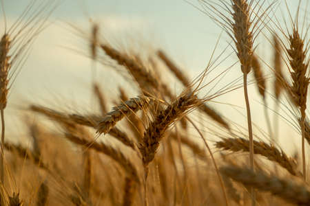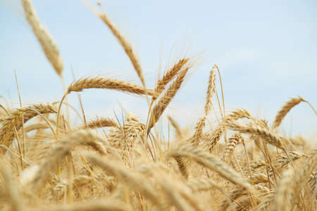 gold ears of wheat against the blue sky soft focus, closeup, agriculture background
