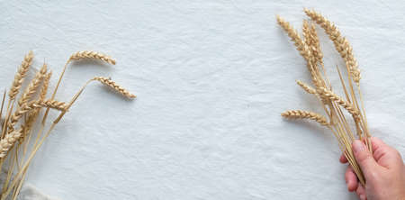 Panoramic flat lay with wheat ears in hand on white textile background, banner design with text space.