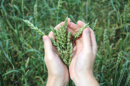 Close-up womans hands hold a handful of grains of wheat, rye in a wheat, rye field. A womans hand holds ripe grains of cereals on a blurred background of grain field. View from above Harvest concept