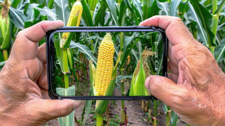 A farmer takes a photo of his harvest with a smartphone in a corn field. Pride fills his eyes as the farmer captures his bountiful cornfield on his smartphone.