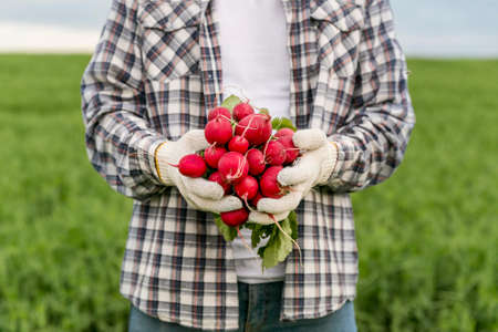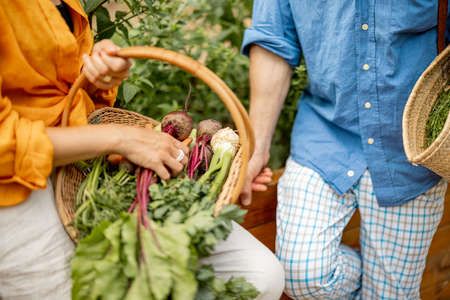 Farmers holds freshly picked beetroot in basket at garden, close-up