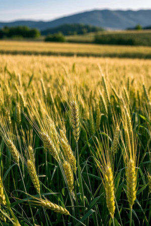 Close-up of yellow ripe ears of wheat in the field in beautiful sunlight. A blue sky in the background. selective focus. The business of growing wheat on a private farm