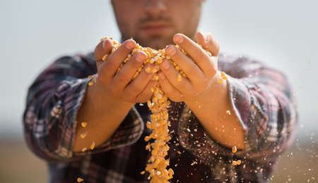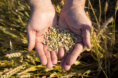 Close-up farmers hands hold a handful of grains of wheat, rye in a wheat, rye field. A mans hand holds ripe grains of cereals on a blurred background of a grain field. Top view. Harvesting concept.