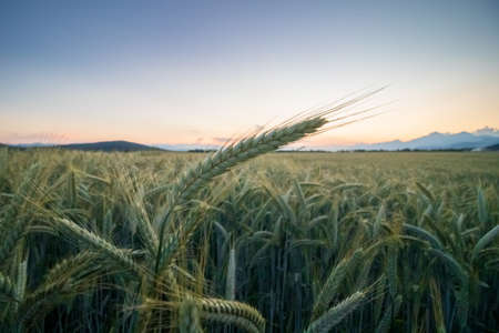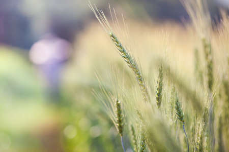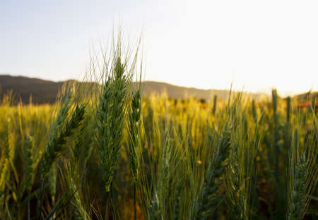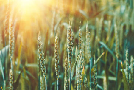 Green wheat growing and maturing on the field in spring and summer, agricultural background