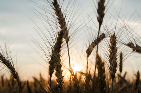 Agricultural field. Ripe ears of wheat on the background of the sunset. The concept of a rich harvest.