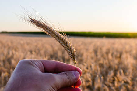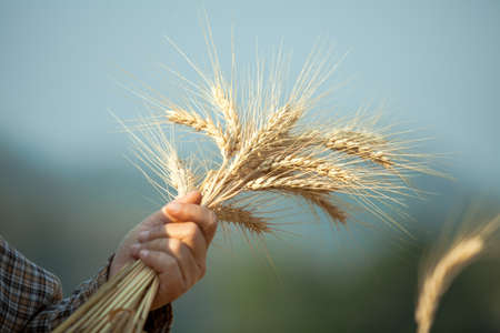 Wheat field with a farmer holding ears of rye in his hand. Wheat harvest on a summer sunny field. Agriculture, farming and growing bio eco food. high quality photo