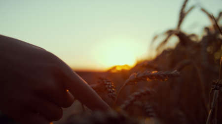 Farmer hand touching spikelets at sunset close up. Beautiful countryside view. Unrecognized woman professional agronomist examining grain quality after hard day. Modern agricultural business concept.