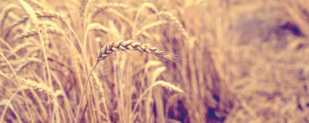 Wheat field, close up shot. Ripe ears of wheat grow on the nature.