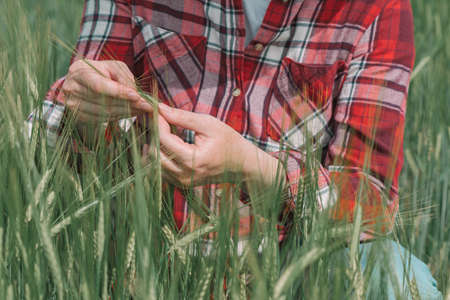 Hands of female farmer agronomist examining green barley ears in field, close up of hands touching crops