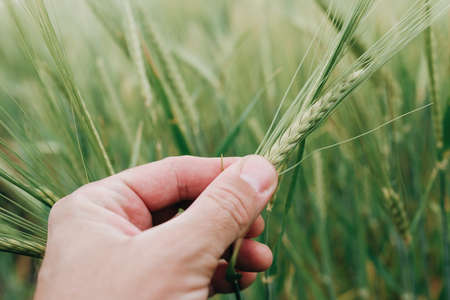 Agronomist examining ear of barley crop in field, close up of hand holding Hordeum vulgare plant, selective focus