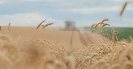 Ripe ears of wheat in the field in beautiful sunlight. selective focus. The business of growing wheat on a private farm