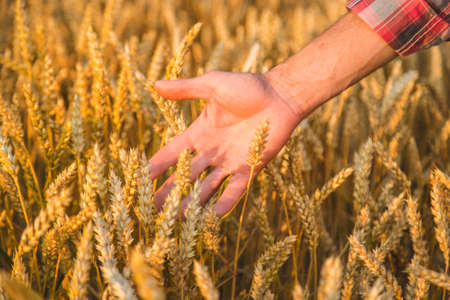 Farmers hand gently touching a golden ripe ear of wheat growing in the field.