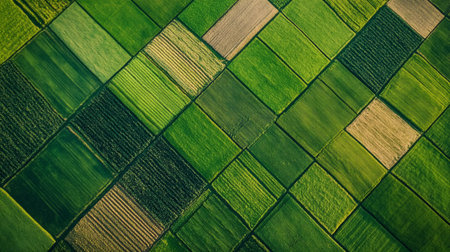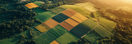 Sustainable showing expansive aerial view of agricultural fields divided into rectangular strips of various crops showing green yellow brown and red hues keywords:...