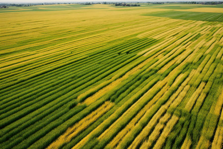 Aerial view of the yellow and green wheat field in Poland.