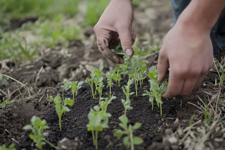 Hands are gently placing seeds into fertile soil, surrounded by emerging green plants, illustrating the nurturing process of gardening and agricultural practices, AI generated