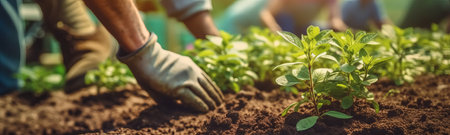 hands plant plants, local food production. trees in the ground close up. Concept of Save World, Earth day and Community Engagement, ultra wide format, by ai generative