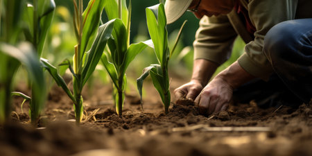 A man is planting corn in a field. The corn is growing in the dirt and the man is tending to it