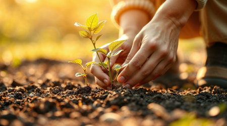 Person planting a young plant in rich soil against a sunny background. generated by ai