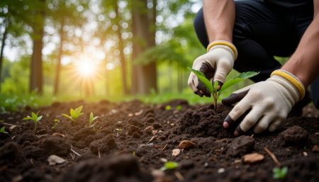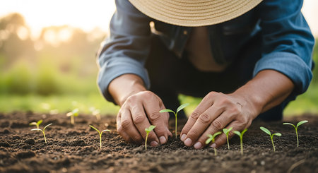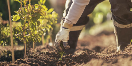 A dedicated gardener carefully plants young seedlings in rich, dark soil, symbolizing the nurturing of life and sustainability in modern gardening practices under warm sunlight.