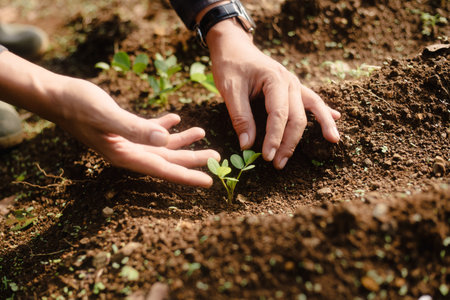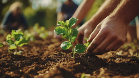 Hands delicately plant seedlings in rich soil, showcasing a moment of care and collaboration in a nurturing outdoor environment. Perfect for agricultural themes.