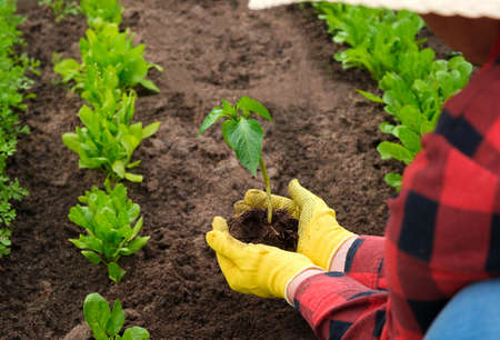 Hand of gardener seedling young vegetable plant in the fertile soil. Woman's hands in yellow gloves and red shirt is gardening. Female farmer planting peppers in the ground. organic cultivation.